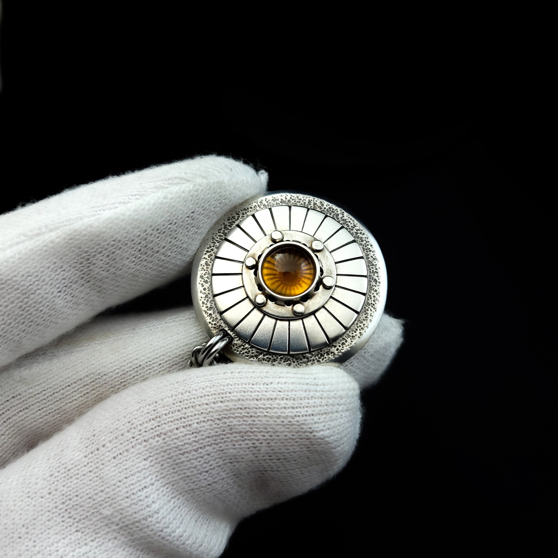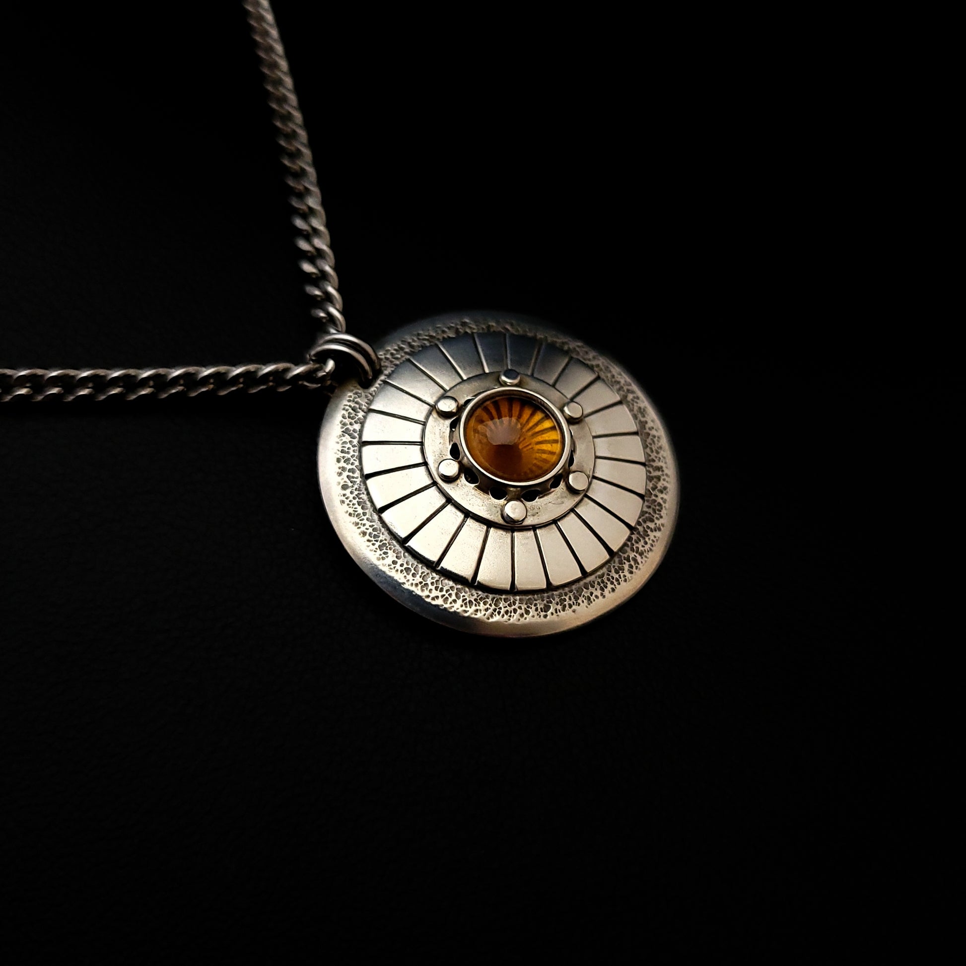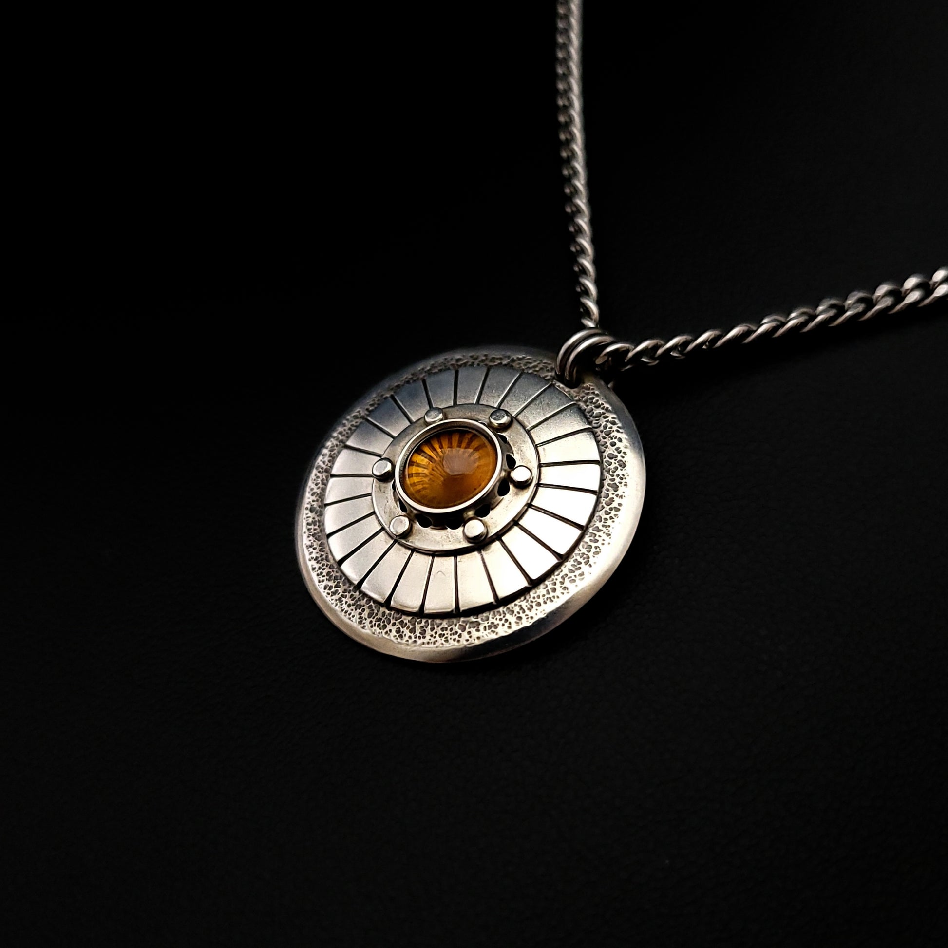 Features an 8mm Citrine cabochon with line work cut into the silver behind the stone.