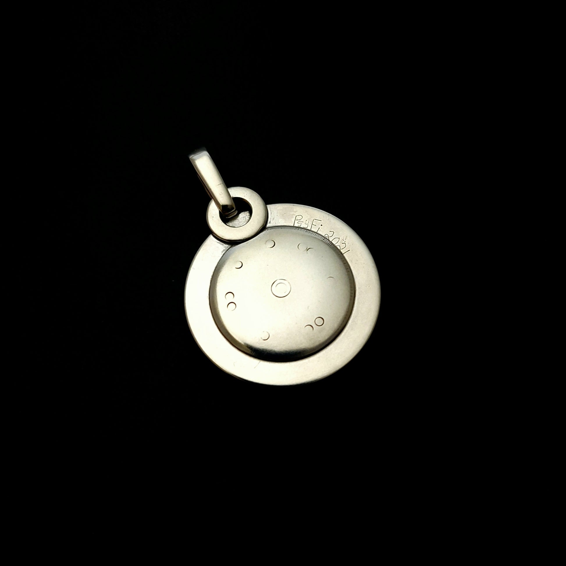Measures about 1 inch in diameter and is 1/4 inch thick at center tappering down towards the edges. This pendant has a lentil bean, or "flying saucer" type shape.